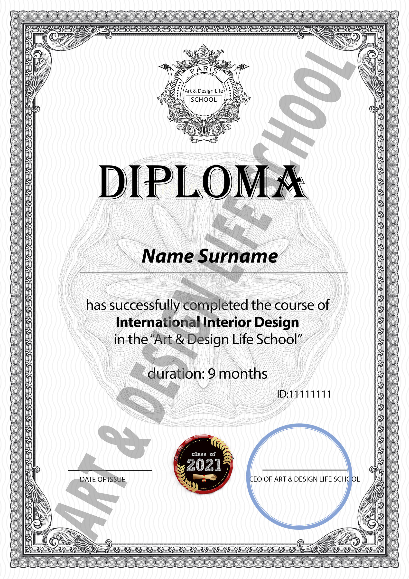 При успешном окончании обучения Вы получаете ДИПЛОМ международного образца по специальности "Международный дизайнер интерьера"